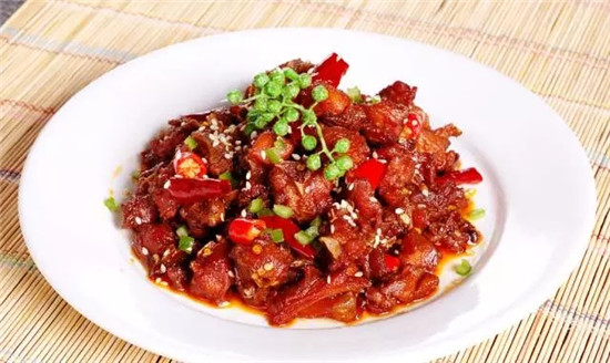 提示:兔丁腌碼時鹽味不宜過重,炸收火候適宜色澤不能鍋深,收汁時應(yīng)微火慢烹以汁干略微吐油時,起鍋為宜。