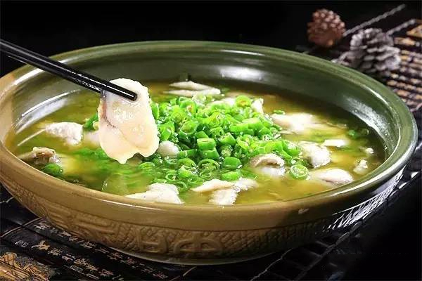 4、把魚片放原湯鍋里煮熟后,連湯一起倒入盛器內(nèi),撒上青椒圈和蔥花,澆上熱油便可上桌。
