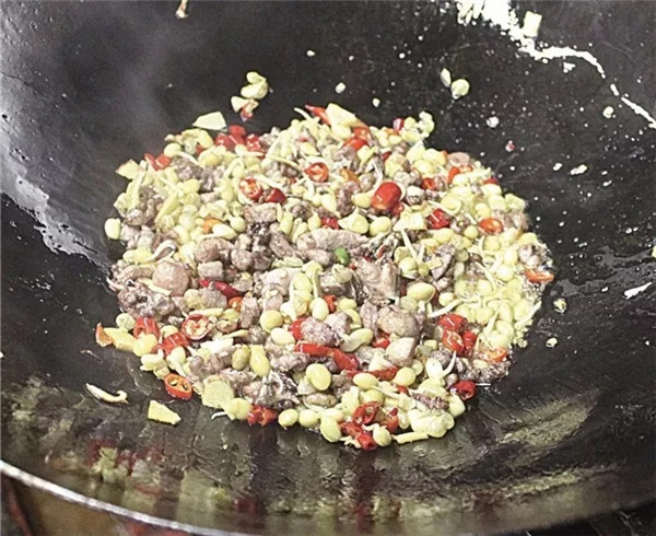 鍋入豬油和菜籽油各100克燒至七成熱,加姜丁150克、小米辣圈50克、大蒜子20克爆香,倒入鴨肉丁400克煸炒五六分鐘至熟,下黃豆芽150克、酸蘿卜丁100克,調(diào)入生抽10克、味精8克、雞精7克,翻勻出鍋即可。