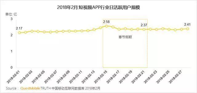 QuestMobile數(shù)據(jù)顯示,2018年除夕當(dāng)天,短視頻行業(yè)日活躍用戶規(guī)模突破2.58億、行業(yè)滲透率達(dá)到27.6%,兩項(xiàng)指標(biāo)均達(dá)到歷史巔峰。