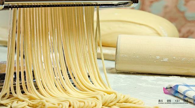 面條是由小麥粉制成,而小麥粉又是由面筋蛋白和淀粉構(gòu)成。其中面筋蛋白(主要是麥醇溶蛋白和麥谷蛋白)不溶于水,制作面食的過程中,麥醇溶蛋白和麥谷蛋白大量吸水膨脹,導致分子間互相粘連,從而將淀粉分子包裹在其中,最終形成了筋道的面團。