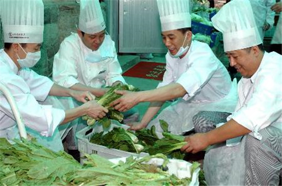 況且大工們擇菜的技術(shù)比較高,經(jīng)驗也豐富,極大地減少了浪費,所以原料的出成率很高。比如擇菜心,下腳料部分處理好后直接交給負(fù)責(zé)切配的同事,改成粒后制作青菜缽,就是下腳料的再利用。