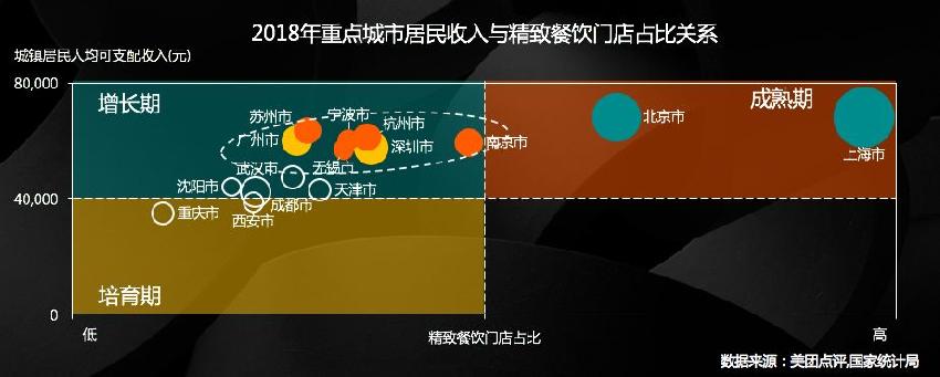 當(dāng)然,精致餐飲門店在當(dāng)?shù)卣烷T店中的占比與居民消費(fèi)能力呈正相關(guān),上海、北京屬于精致餐飲占比高、居民消費(fèi)力高的成熟市場(chǎng)。