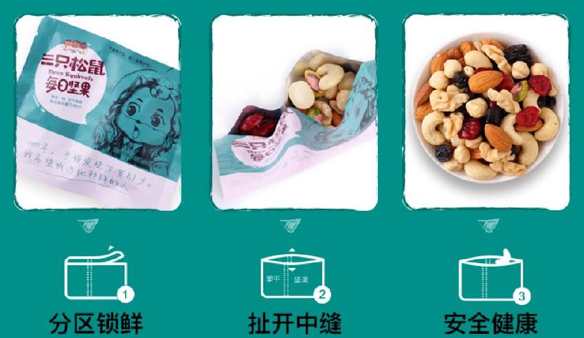 例如三只松鼠推出的每日堅(jiān)果零食,為了保證堅(jiān)果酥脆和果干溫潤而自然的最佳質(zhì)構(gòu)口感,對于產(chǎn)品水分含量的控制和要求非常嚴(yán)格,從包裝的角度采用了堅(jiān)果果干分區(qū)鎖鮮的設(shè)計(jì),使用時(shí)扯開中縫即可食用,更精準(zhǔn)地實(shí)現(xiàn)了水分控制,自然調(diào)和產(chǎn)品的酸甜脆軟。