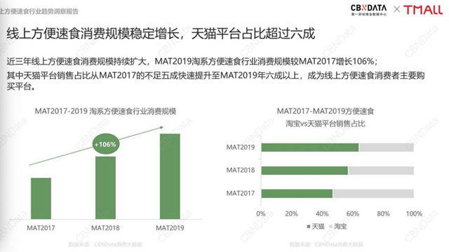 隨著人們生活節(jié)奏的加快,方便速食已成為食品行業(yè)新的增長(zhǎng)引擎。報(bào)告顯示,2019年淘系方便速食行業(yè)消費(fèi)規(guī)模較2017年增長(zhǎng)106%。同時(shí),方便速食領(lǐng)域品牌矩陣更加豐富,新興品牌加速崛起,為行業(yè)注入新鮮活力。尤其是新銳網(wǎng)紅速食品牌表現(xiàn)搶眼,增速?gòu)?qiáng)勁,攬獲一大波新生消費(fèi)力量的青睞。