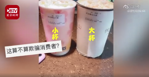 網(wǎng)友曬出的對比圖,同時買了大小杯,拆完大杯“隔熱層”以后分量幾乎一樣。/@時間視頻