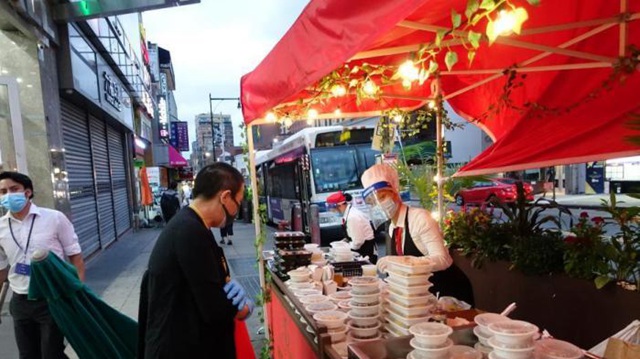 資料圖:當(dāng)?shù)貢r(shí)間8月16日晚,一家中餐廳在紐約法拉盛社區(qū)街道旁外賣菜肴。隨著紐約經(jīng)濟(jì)活動(dòng)的恢復(fù),當(dāng)?shù)孛癖娨归g活動(dòng)逐漸增多。中新社記者 廖攀 攝