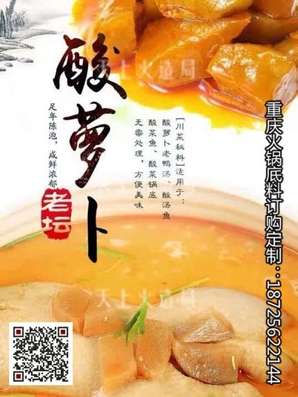 ●【酸蘿卜老鴨湯底料】酸蘿卜老鴨湯是一道屬渝菜中的經(jīng)典燉品。主要食材是鴨子和酸蘿卜,主要烹飪工藝是燉。在川渝地區(qū),酸蘿卜老鴨湯已經(jīng)發(fā)展成為了火鍋的一種。 酸度★★★★...